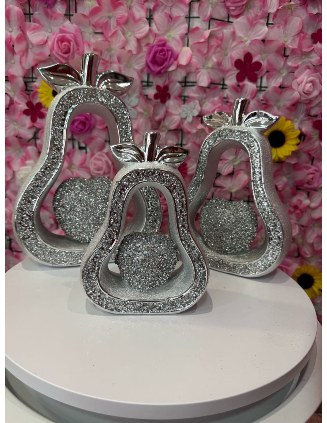 jugo de 3 PERASs plateadas con manzana de piedras dentro pequeñas el precio incluye juego de 3piezas puro lujo!!!!