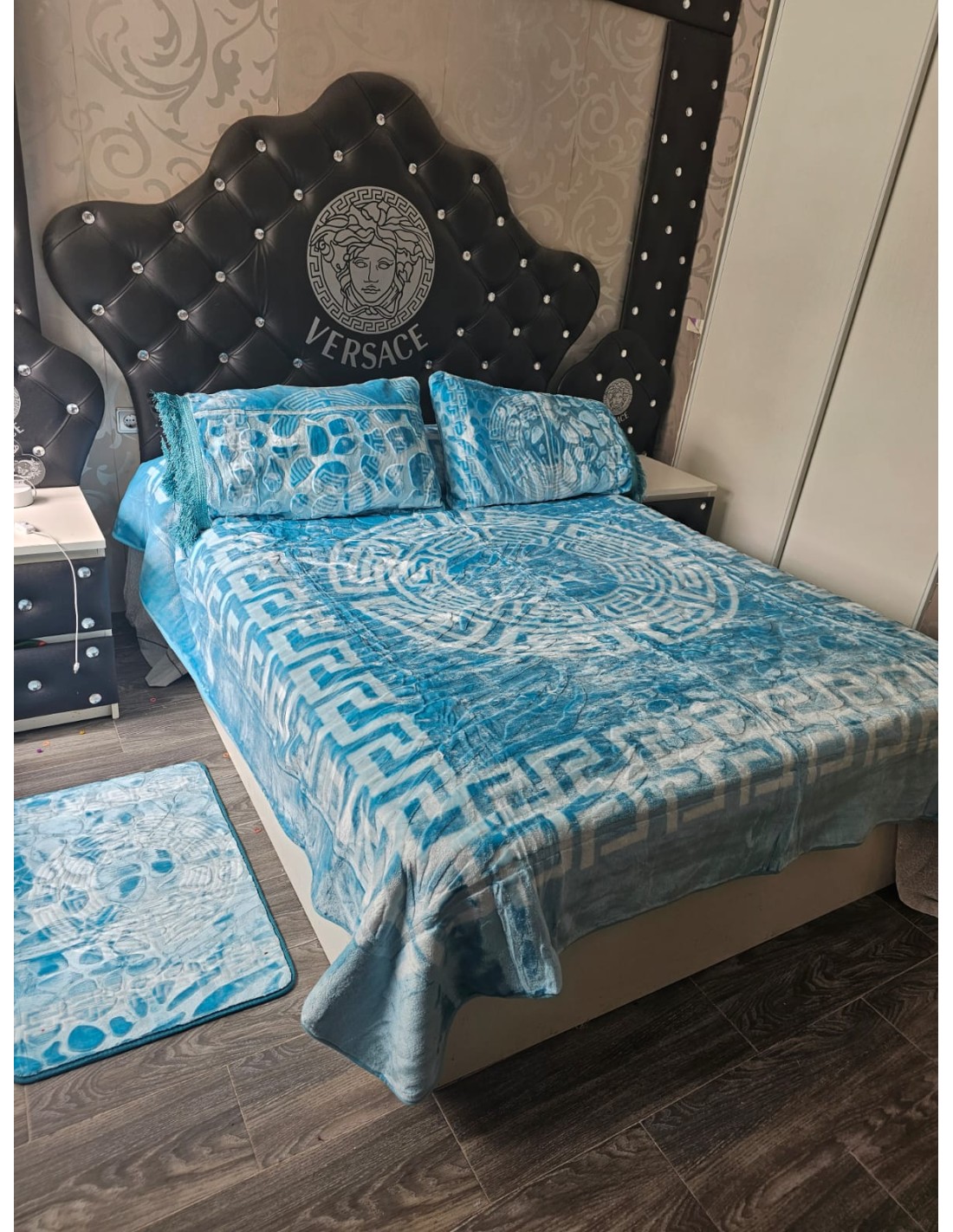 conjunto de Versace manta gorda buena con dos fundas de cojín y dos alfombras incluye 5 piezas en total todo de terciopelo y buena calidad manta mide 220x240